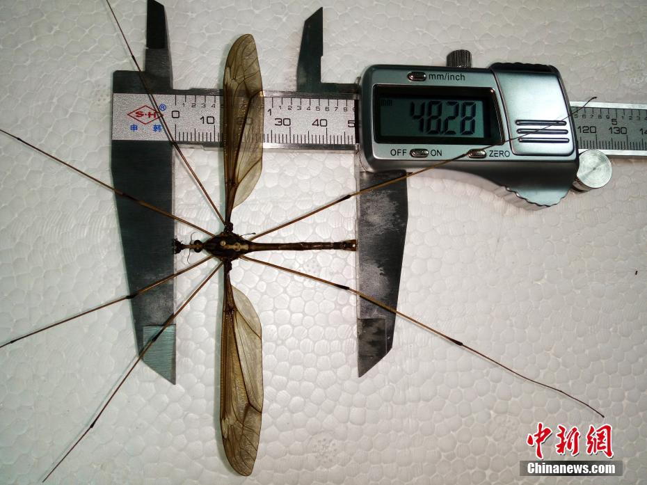 2017年8月,成都华希昆虫博物馆在四川成都青城山采集到的一只巨大蚊个体翅展达到11.15厘米,远超过该记录,也超过了可以查询到的该种最大翅展记录10.2厘米(网络记载,非正式发表记录)。成都华希昆虫博物馆发现的该个体应为已知世界最大蚊子个体。图为蚊子活体。赵力 摄