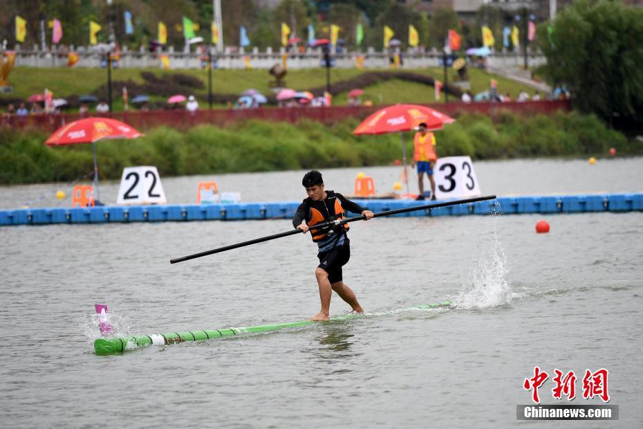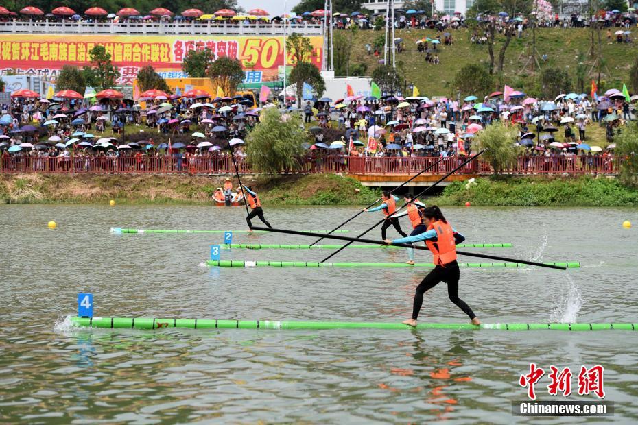 6月30日,广西河池市环江毛南族自治县举行“水上轻功”独竹漂比赛,选手脚踏漂流在水面上的单棵楠竹,手执一根细竹竿为“桨”,依靠小竹竿划动实现水上漂行。当日,2018年广西环江·毛南族分龙节暨第四届世界自然遗产文化旅游节开幕。环江是中国唯一的毛南族自治县,是广西首个世界自然遗产地。中新社记者 俞靖 摄
