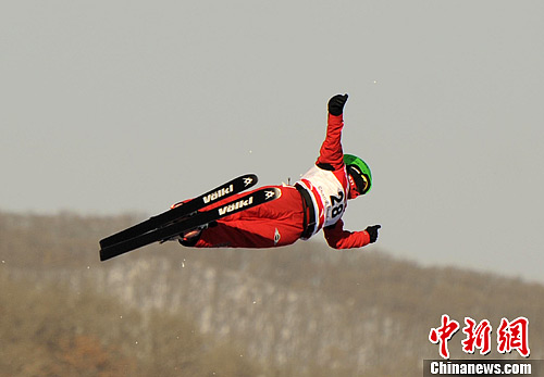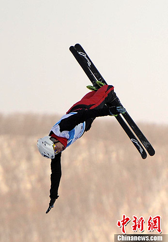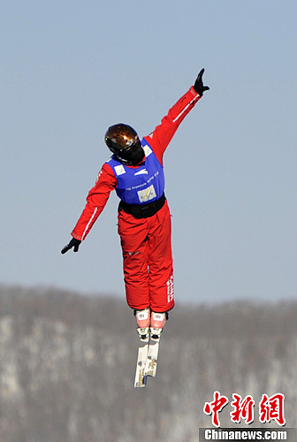 1月5日,2012—2013国际雪联自由式滑雪空中技巧世界杯在长春莲花山滑雪场举行,阔别赛场两年的李妮娜复出参赛并夺得季军。图为李妮娜在比赛中。中新社发 张瑶 摄